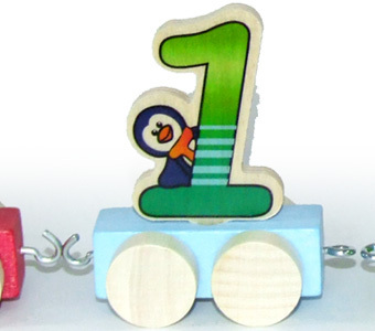 Zahl aus Birkenleimholz auf Rädern, farblich sortiert.