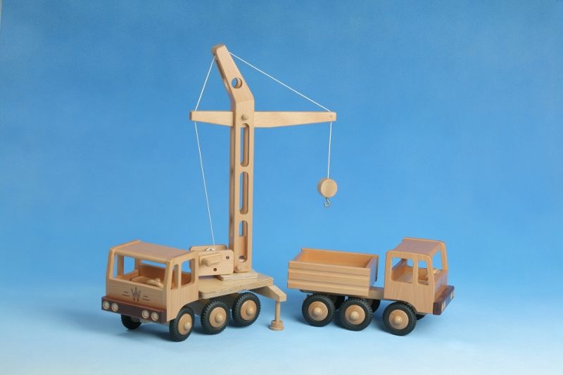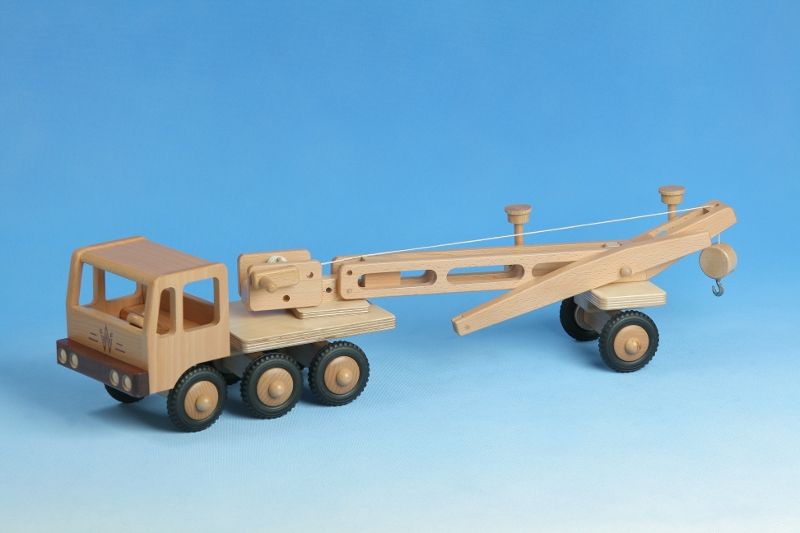 Länge: 32 cm (aufgebaut)3-Achs-LKW mit Aufsatz Turmdrehkran.Die Lenkung erfolgt über das drehbar montierte Fahrerhaus.Reifenmaterial: Vollgummi, welcher als "lebensmittelecht" zertifiziert wurde.