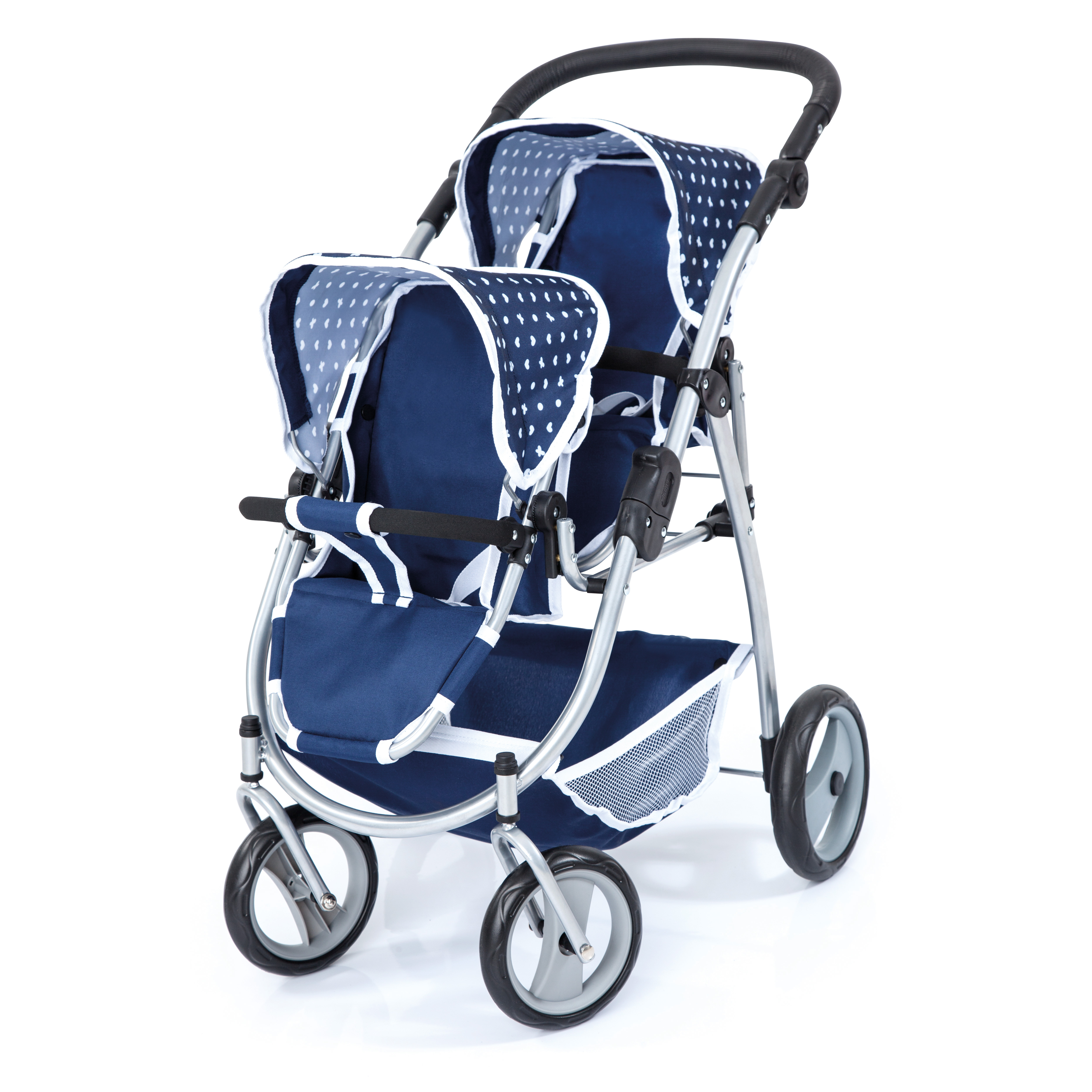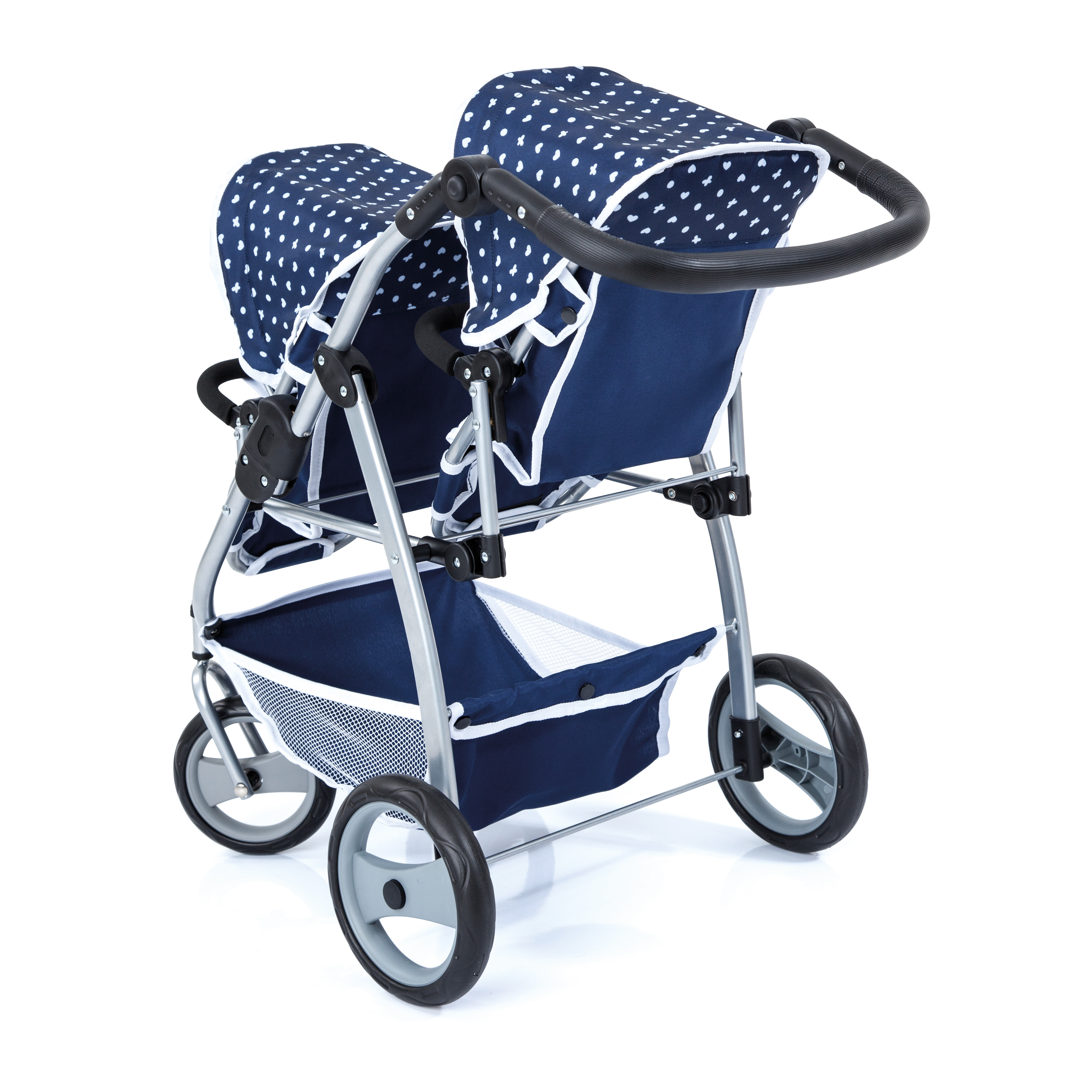 Moderner Zwillingswagen für Puppen bis zu 46 cm. Der Wagen besitzt verstellbare Sonnenverdecke und einen höhenverstellbaren Griff. Er kann platzsparend zusammengeklappt werden. Im Einkaufskorb kann alles verstaut werden, was die Puppenmutti für den Ausflug mit ihrem kleinen Liebling benötigt.