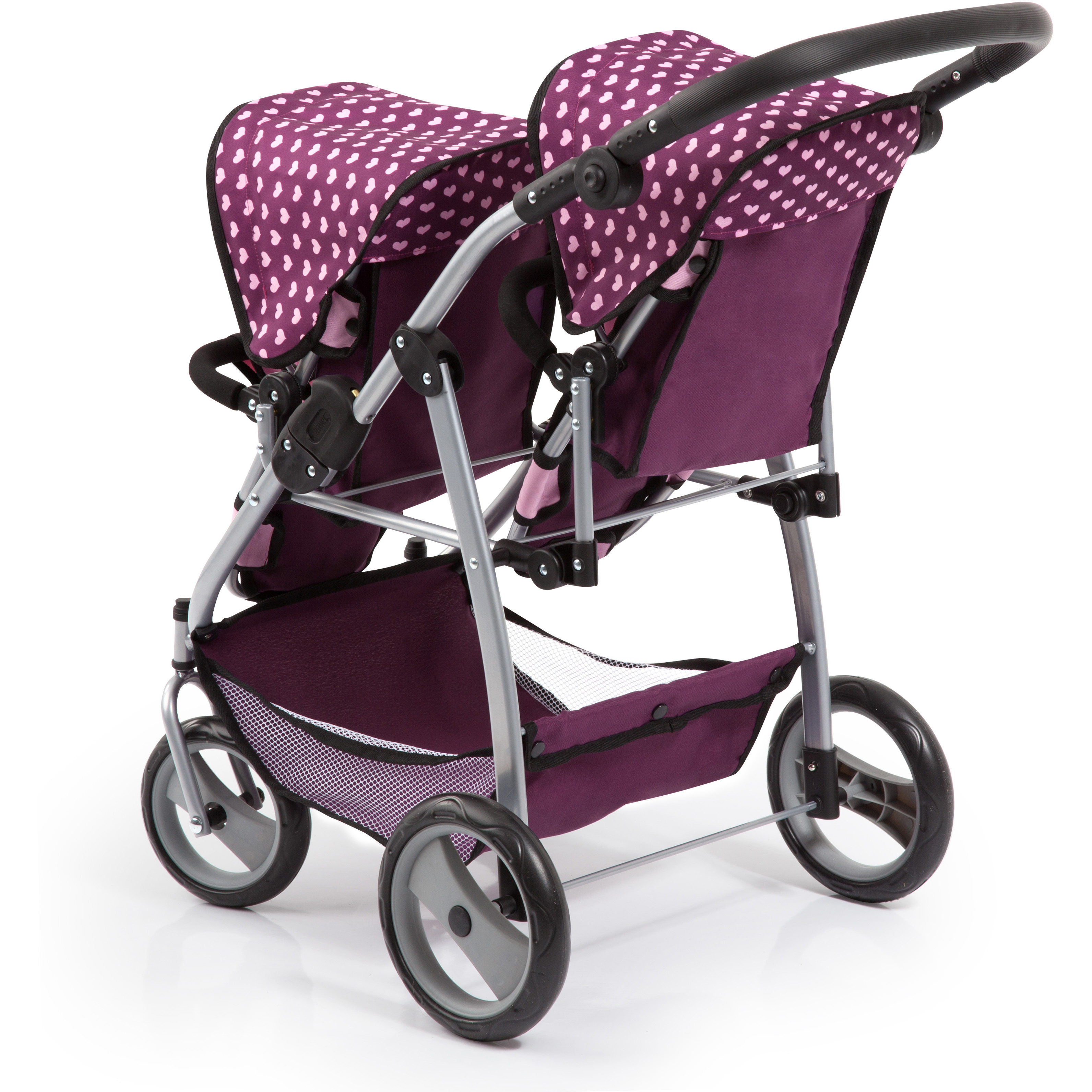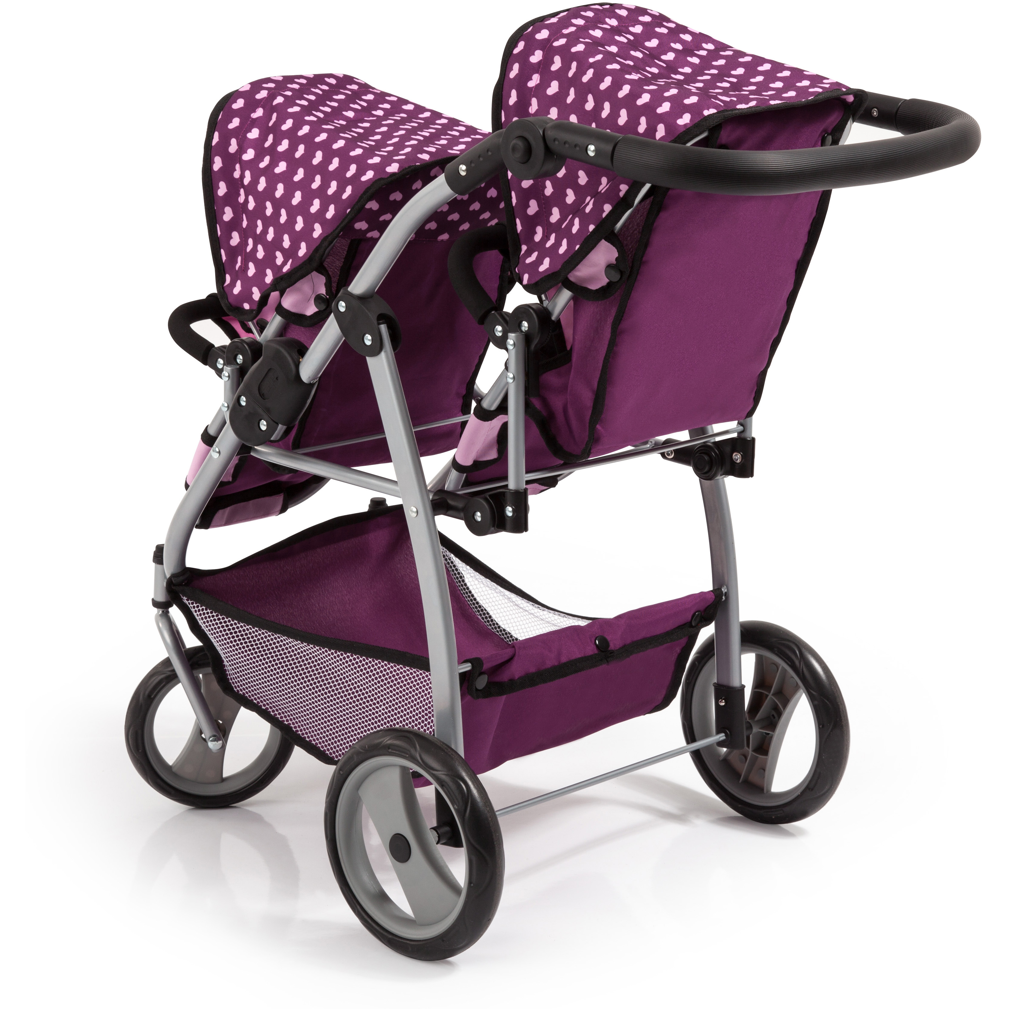 Moderner Zwillingswagen für Puppen bis zu 46 cm. Der Wagen besitzt verstellbare Sonnenverdecke und einen höhenverstellbaren Griff. Er kann platzsparend zusammengeklappt werden. Im Einkaufskorb kann alles verstaut werden, was die Puppenmutti für den Ausflug mit ihrem kleinen Liebling benötigt. Lieferung erfolgt in hübscher Geschenkverpackung.